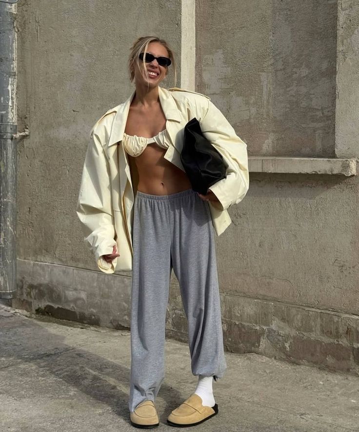 A playful bralette contrasts with relaxed grey sweatpants, while the oversized jacket throws in a bold proportion play. Finished with slipper-style shoes, socks, and a clutch, the look nails elevated loungewear with an off-duty edge.