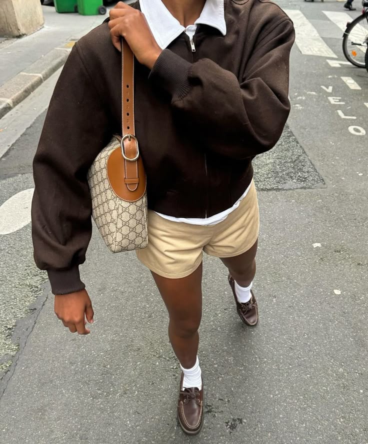 Preppy with a Parisian edge. A dark bomber with a crisp collar meets beige tailored shorts, white socks, and leather loafers. The monogram shoulder bag elevates it from school-uniform nostalgia to polished streetwear.