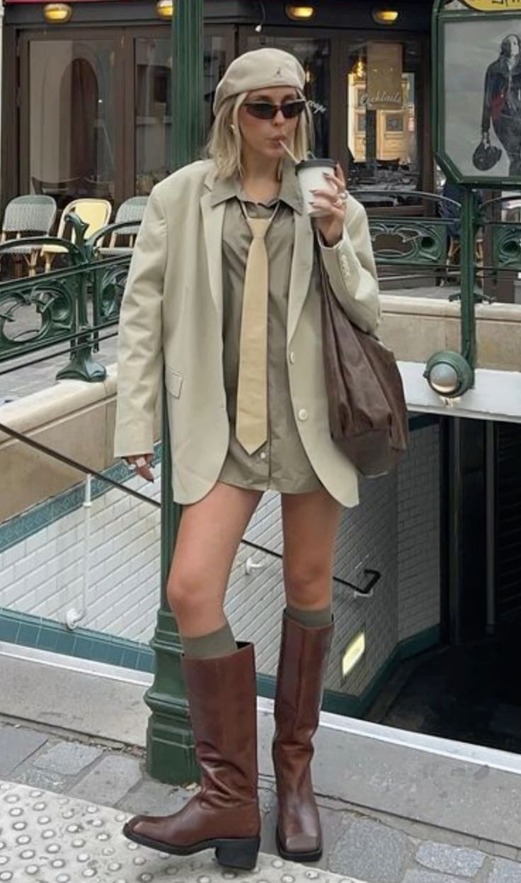 An olive shirt-dress with a beige tie layers under an oversized cream blazer for relaxed sophistication. A beret and narrow sunglasses add Parisian flair, while tall chestnut boots with green socks give a utilitarian edge. A brown tote completes the tailored-meets-relaxed balance.