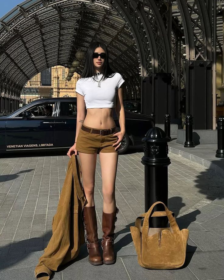 A tawny suede jacket drapes effortlessly over matching micro shorts, cinched by a slim leather belt. The crisp white crop top is sharply minimalistic. Tall leather riding boots provide an equestrian edge.