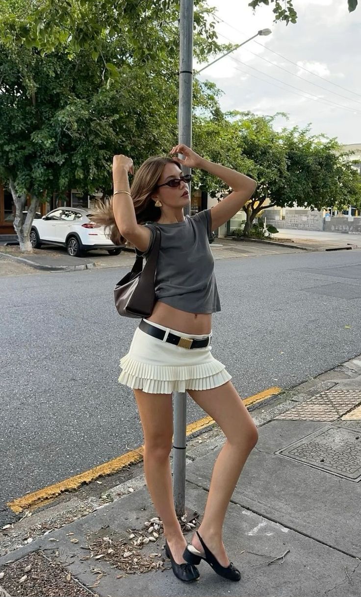 Effortless minimalism is achieved with a cropped grey t-shirt. It is paired with a pleated cream mini skirt. The outfit is cinched by a black belt with a gold buckle. Black ballet flats, a brown shoulder bag, and statement earrings complete the look. Casual yet polished for warm days transitioning into cooler evenings.