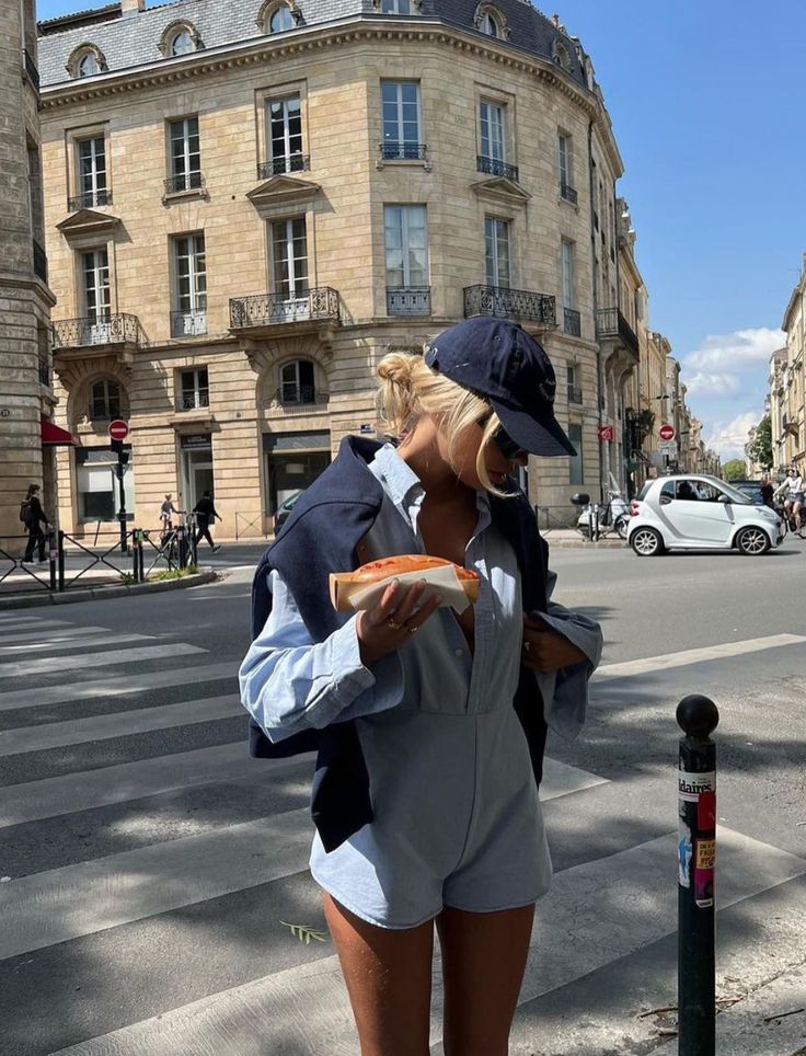 A light blue romper channels effortless Parisian summer chic. It is styled with a navy sweater draped over the shoulders. A baseball cap adds a sporty finish. Minimal jewelry and casual hair keep the look understated yet sharp, perfect for strolling the city.