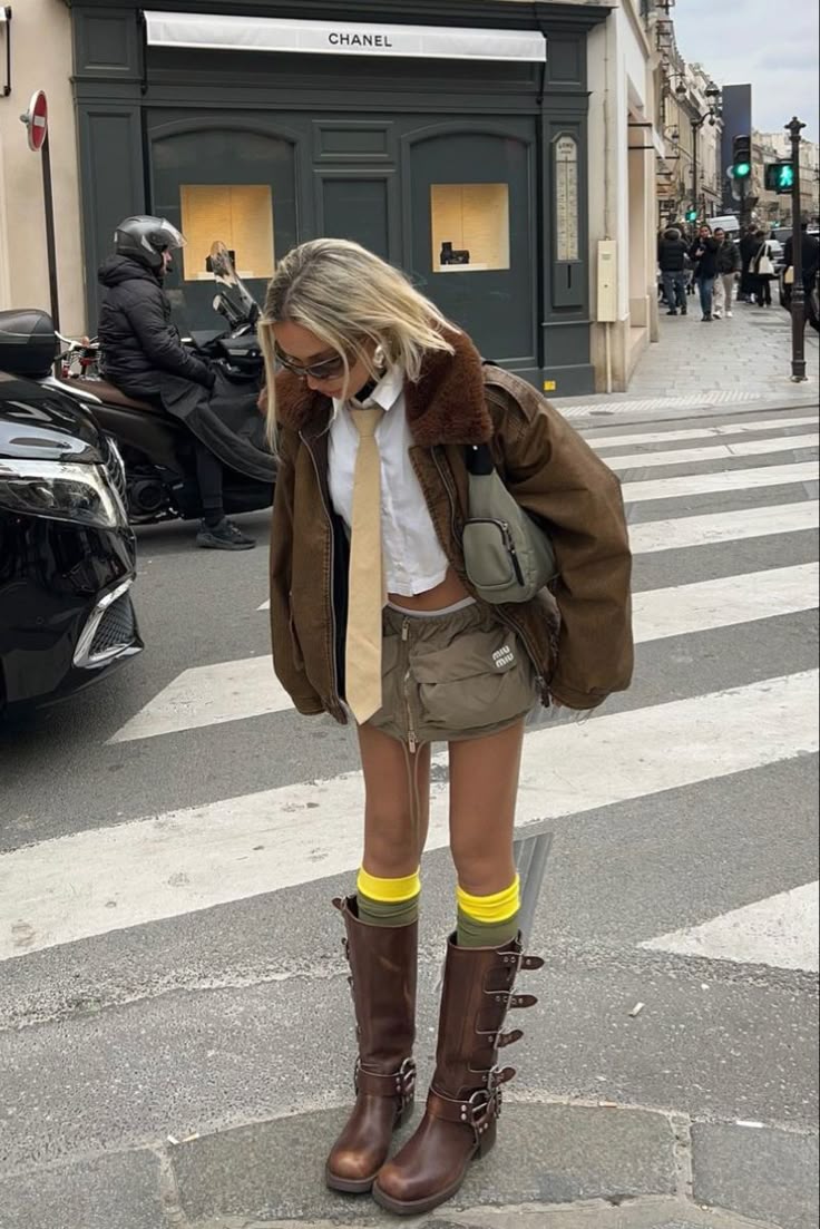Downtown eclectic: a cropped white shirt with beige tie pairs with a khaki Miu Miu micro skirt. An oversized bomber with shearling collar adds contrast. Riding boots with yellow-and-green socks finish the playful street look.
