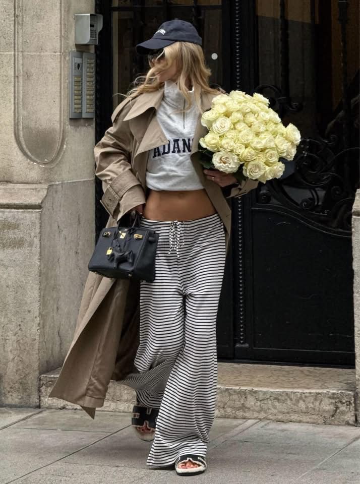 A classic beige trench coat drapes over a cropped grey sweatshirt, giving casual balance to loose striped trousers. Black slide sandals add a relaxed edge, while a baseball cap and structured leather tote elevate the streetwear-meets-parisian mood. The bouquet of white roses completes the effortless city-girl aesthetic.